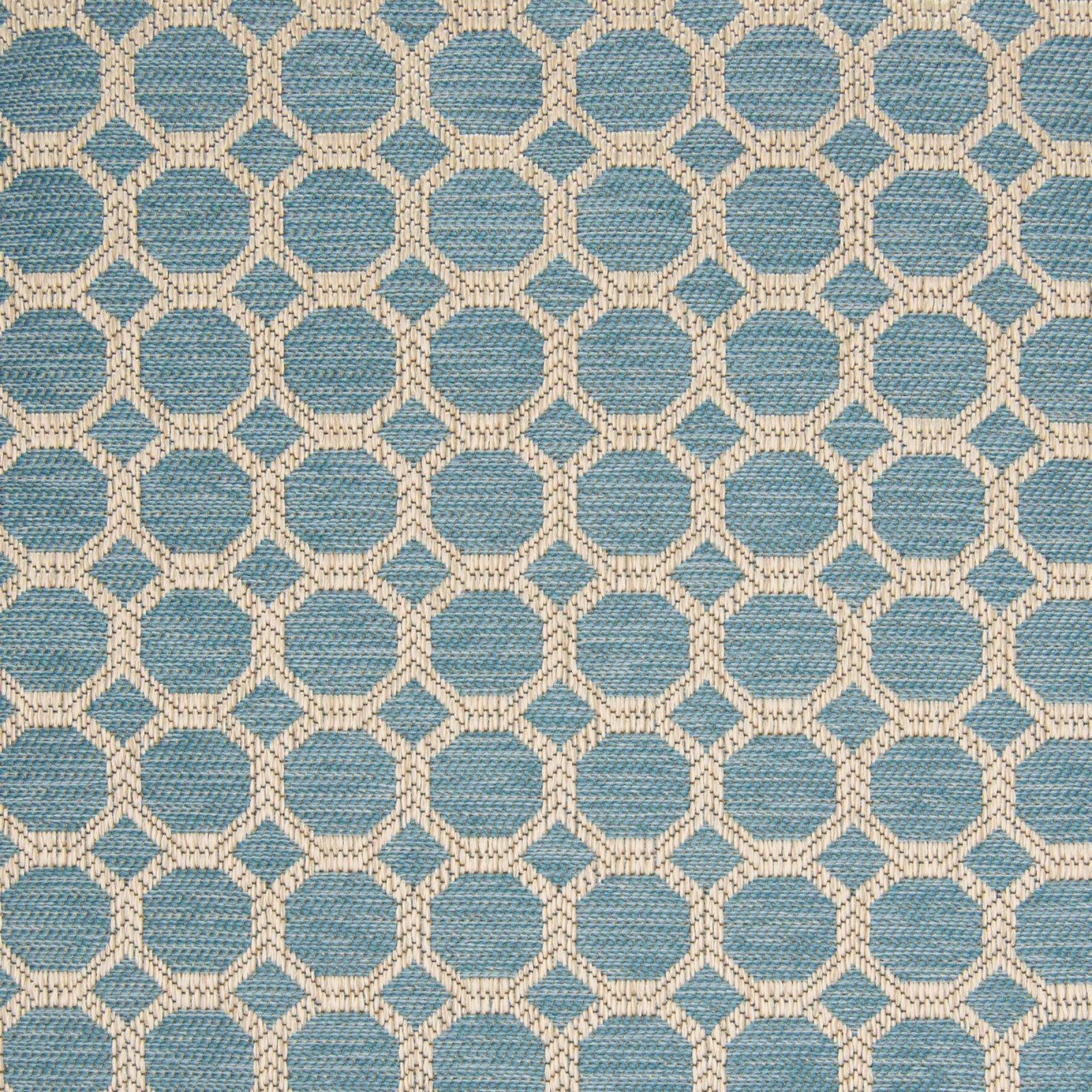 Upgrade your home with this modern geometric brightly colored in teal. This transitional geometric is woven in China and is extremely durable for upholstery seating and fashionable headboards.